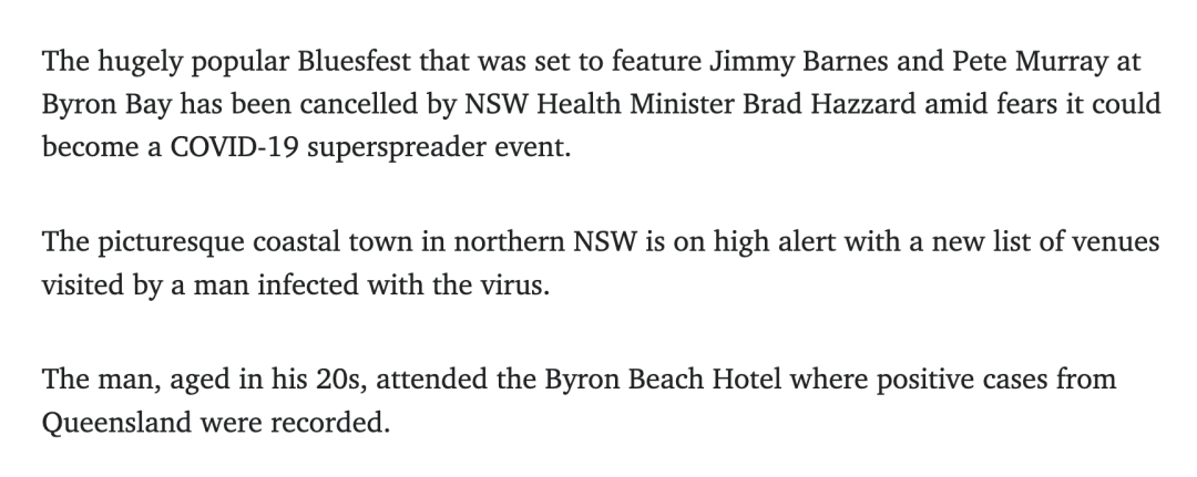 “新州卫生部门承认取消Bluesfest音乐节对门票持有者和活动组织者来说是令人失望的,然而,尽管紧急调查和接触者追踪正在进行,新州卫生部门仍希望采取谨慎的方法来确保每个人的安全。”
