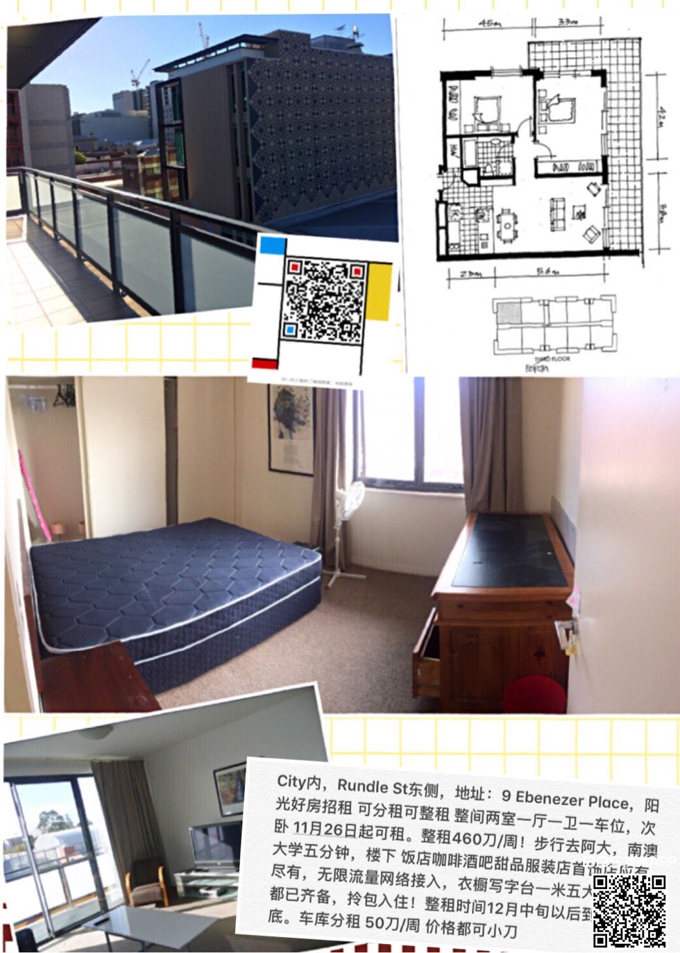 City内,Rundle St东侧,地址:9 Ebenezer Place,阳光好房招租 可分租可整租 整间两室一厅一卫一车位,次卧 11月26日起可租。整租460刀/周!步行去阿大,南澳大学五分钟,楼下 饭店咖啡酒吧甜品服装店首饰店应有尽 ...