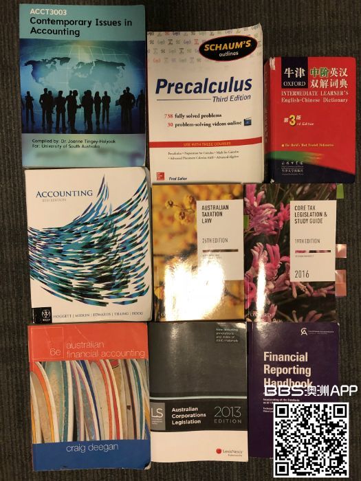 低价卖Unisa商科用书,如下 CIA:$30 Precalculus数学书:$10 牛津英汉双解词典:$10 Accounting 8th Edition:$20 Taxation Law一套:$60 Australian Financial Accounting:$5 Australian Corporations ...