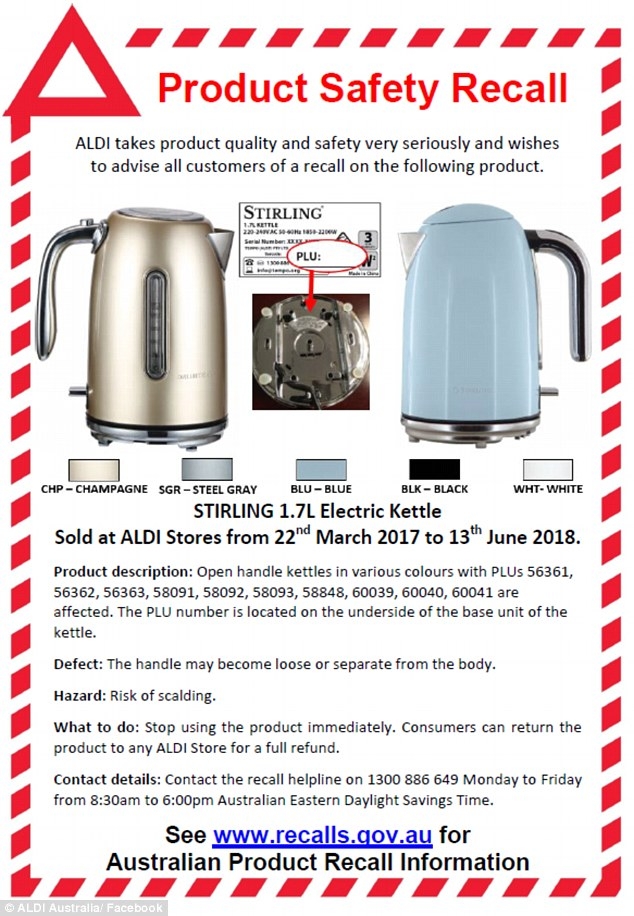 通知!Aldi超市正在召回一款畅销的电热水壶! 水壶的手柄松动可能导致使用者被烫伤! 就是这款: 想要了解有关此次召回的更多详情,可以拨打1300 886 649,进行咨询, 时间:工作日上 ...