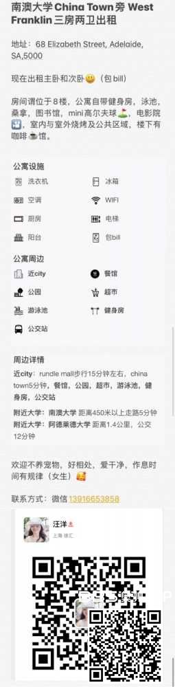 南澳大学chinatown旁三房两卫主卧次卧出租