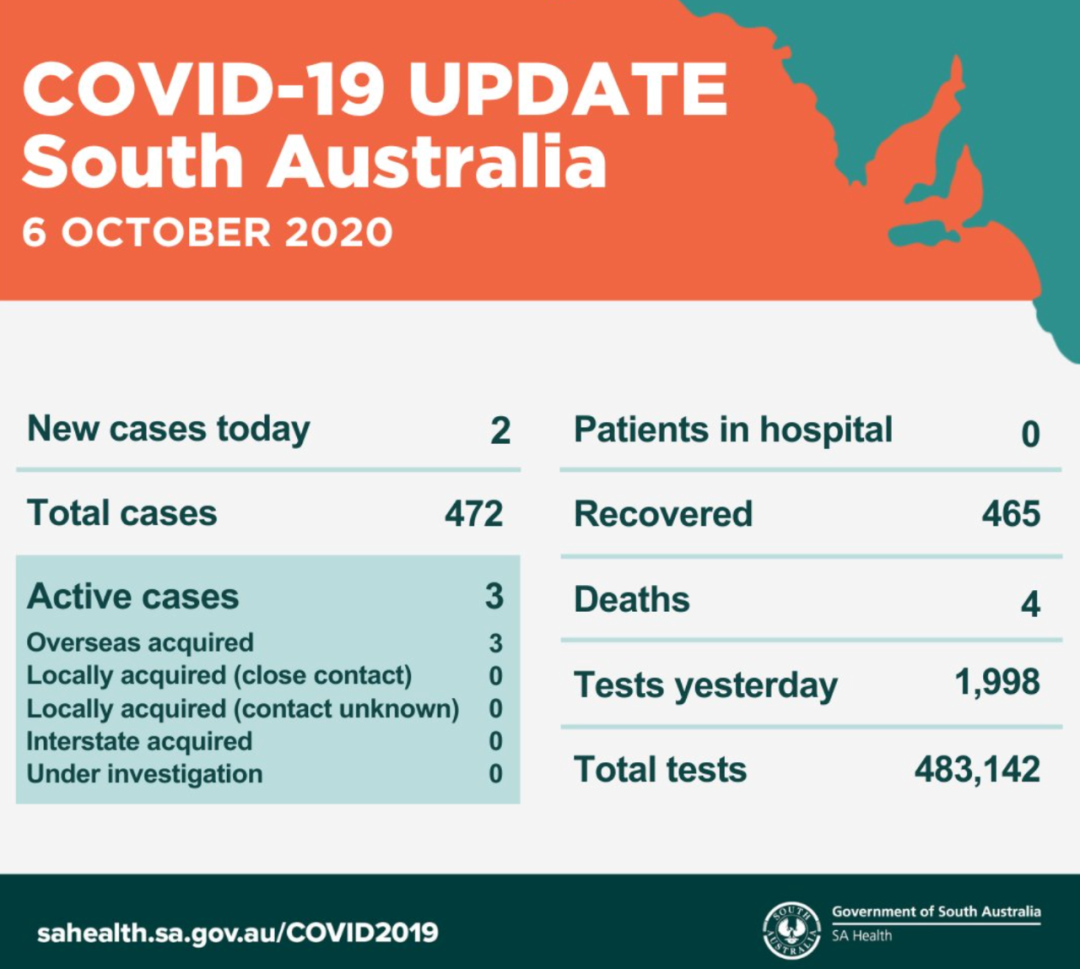 在过去的24小时内,南澳新增2例。 目前南澳有3个活跃病例,已进行了483142次病毒检测。