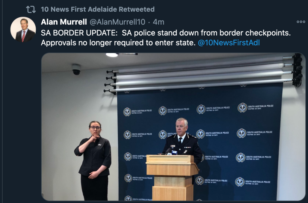 据报道,今天(12月16日)下午,南澳警察局长Grant Stevens宣布南澳的所有边境限制将被取消,边境检查站被撤离,立即生效。 Stevens先生表示,这些限制将立即解除。 此前,旅客必须在网上登记,并通过公路和机场的 ...