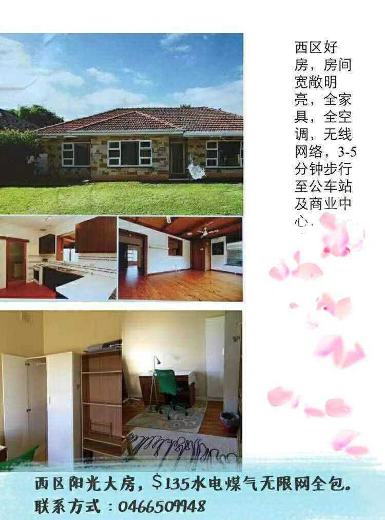 西区阳光大房,每周$135包水电煤气无线网络。可长租可短租。方便便捷。近公车站和商业中心。联系电话0466509948