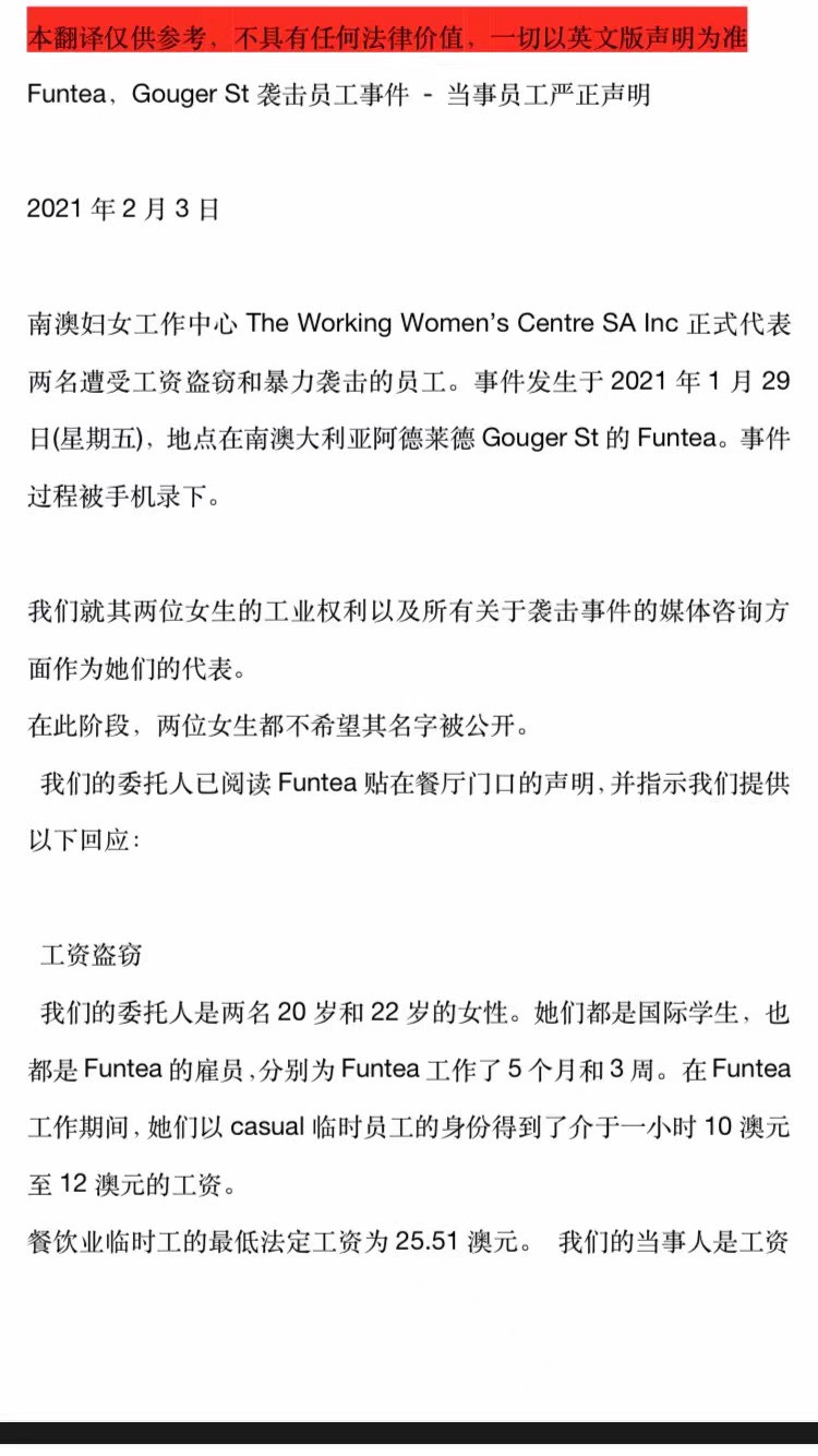 来自阿德莱德奶茶店事件当事女生代表律师working women’s center的个人声明,欢迎广传!