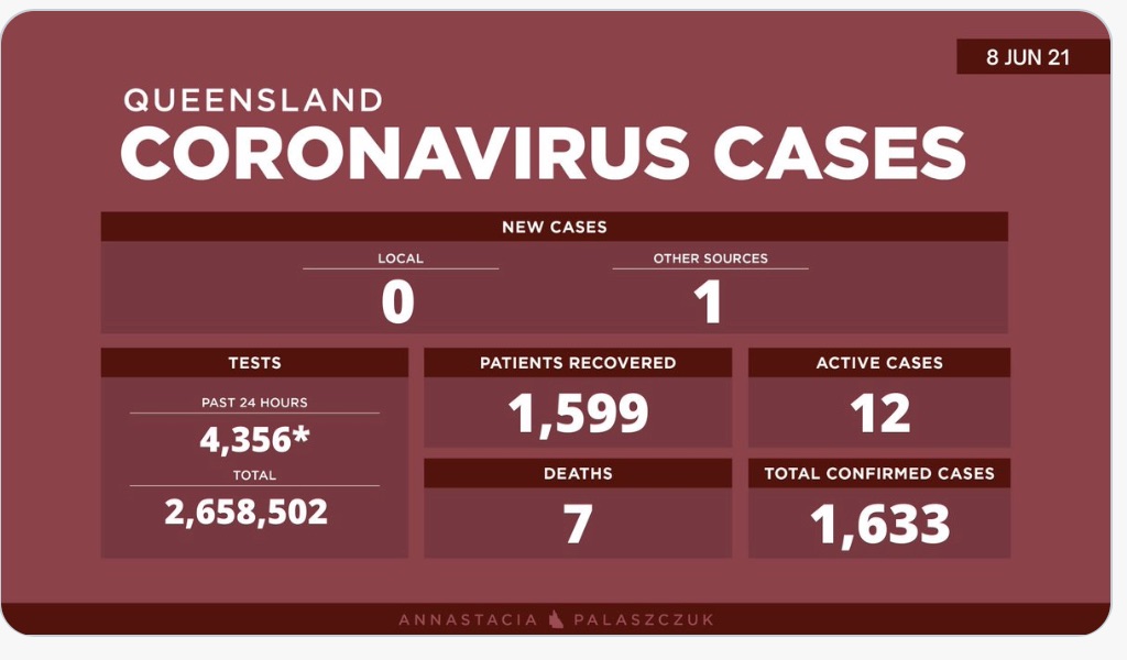 6月8日星期二- 昆士兰的冠状病毒病例更新: - 0例新的本地感染病例 - 1例海外感染病例 - 12例活动病例 -累计确诊 1,633例 - 累计进行了2,65,8502次核算测试 不幸的是,7名COVID-19患者已经死亡。1,5 ...