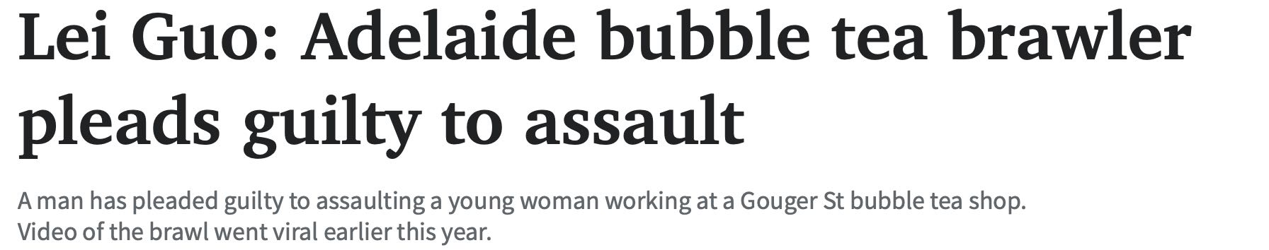 Lei Guo,英文名为Gavin Guo,承认今年2月在FunTea奶茶店殴打袭击了被害人。 3月13日,FunTea在其社交媒体上宣布,该店正处于新的管理之下。 郭先生将于8月出庭接受判决。 图文来源:The Advertiser 原 ...
