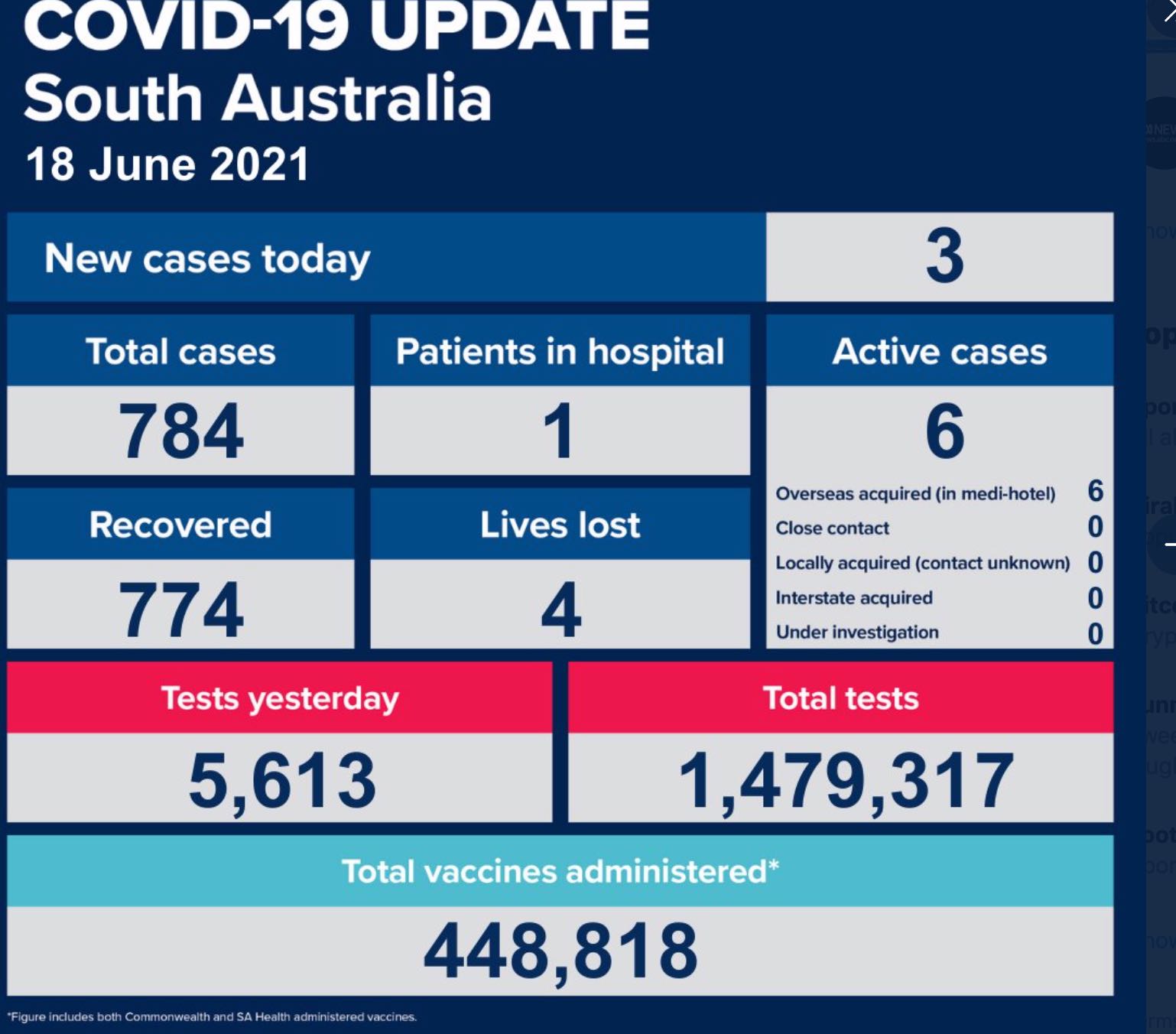 2021年6月18日,星期五,南澳新冠病例情况更新如下: 新增确诊病例3例!无本土感染新增! 活跃病例6例,1例患者在医院中康复与治疗。 康复774例,死亡4例。 昨日共进行检测5613次,累计检测1479317次。 ...