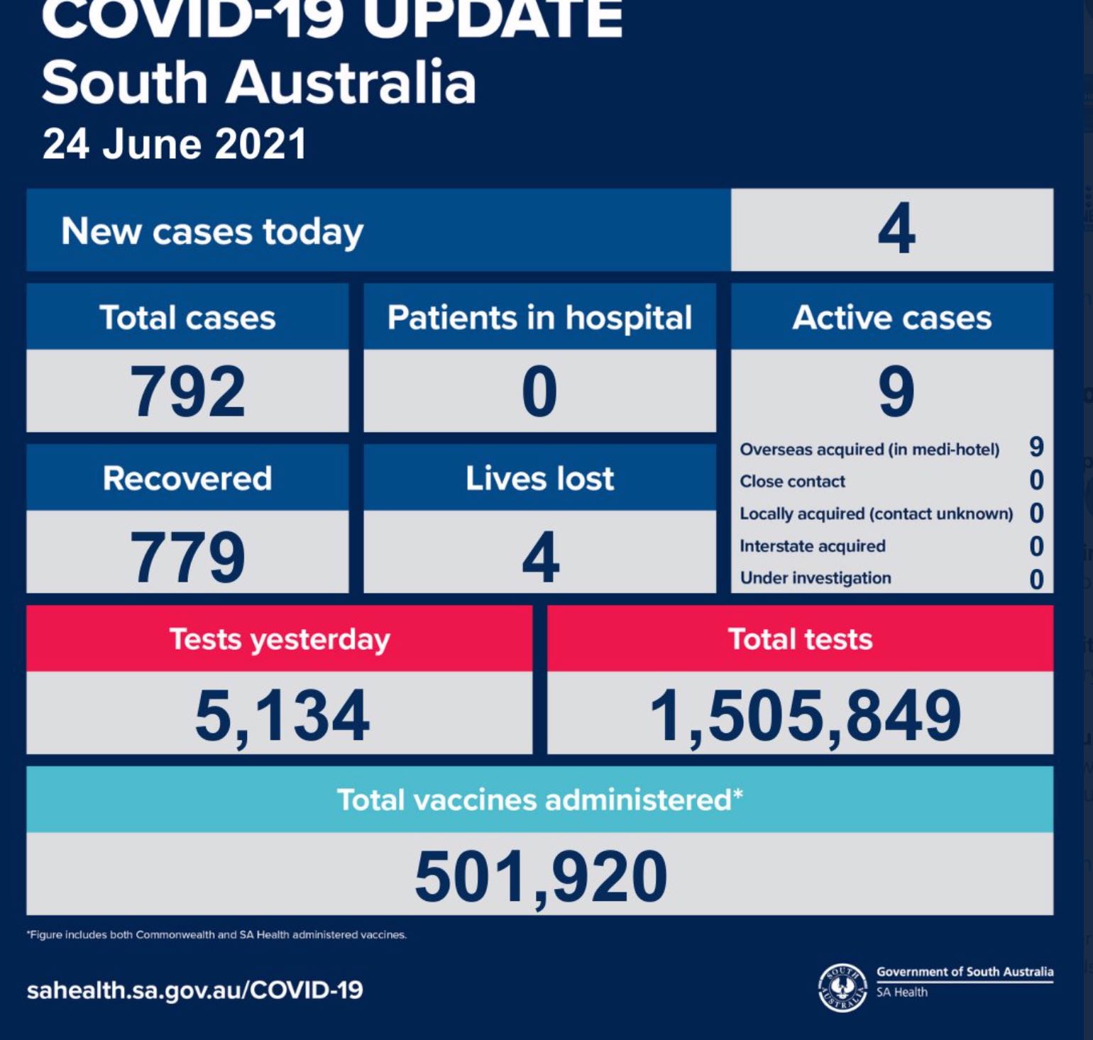 2021年6月24日,星期四,南澳新冠病例情况更新如下: 新增确诊病例4例!无本土感染新增! 活跃病例9例,无患者在医院中康复与治疗。 康复779例,死亡4例。 昨日共进行检测5134次,累计检测1505849次。 ...