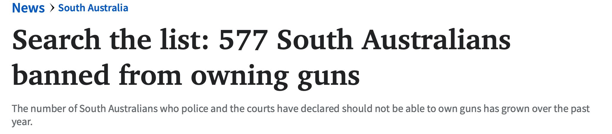 因可能伤害他人或自己,被认为持枪太危险,而不能拥有任何枪支的南澳大利亚人的数量在一年内从518人增加到577人。 在总共577项禁枪命令中,有387项由警察局长签发,190项由法院签发。 但法院在发布禁枪令方 ...