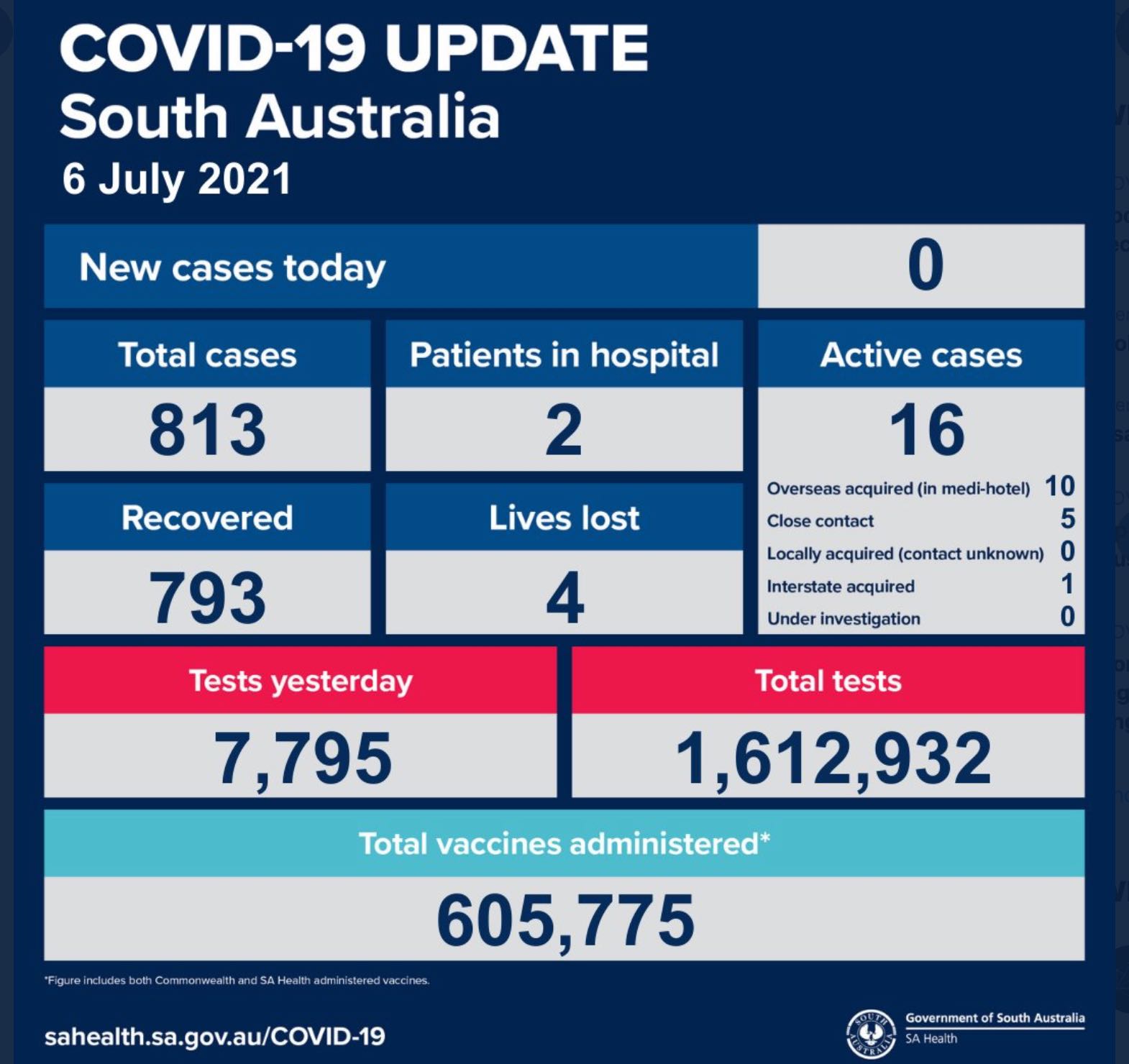 2021年7月6日,星期二,南澳新冠病例情况更新如下: 无新增确诊病例!无本土感染新增! 活跃病例16例,2例患者在医院中康复与治疗。 康复793例,死亡4例。 昨日共进行检测7795次,累计检测1612932次。 ...
