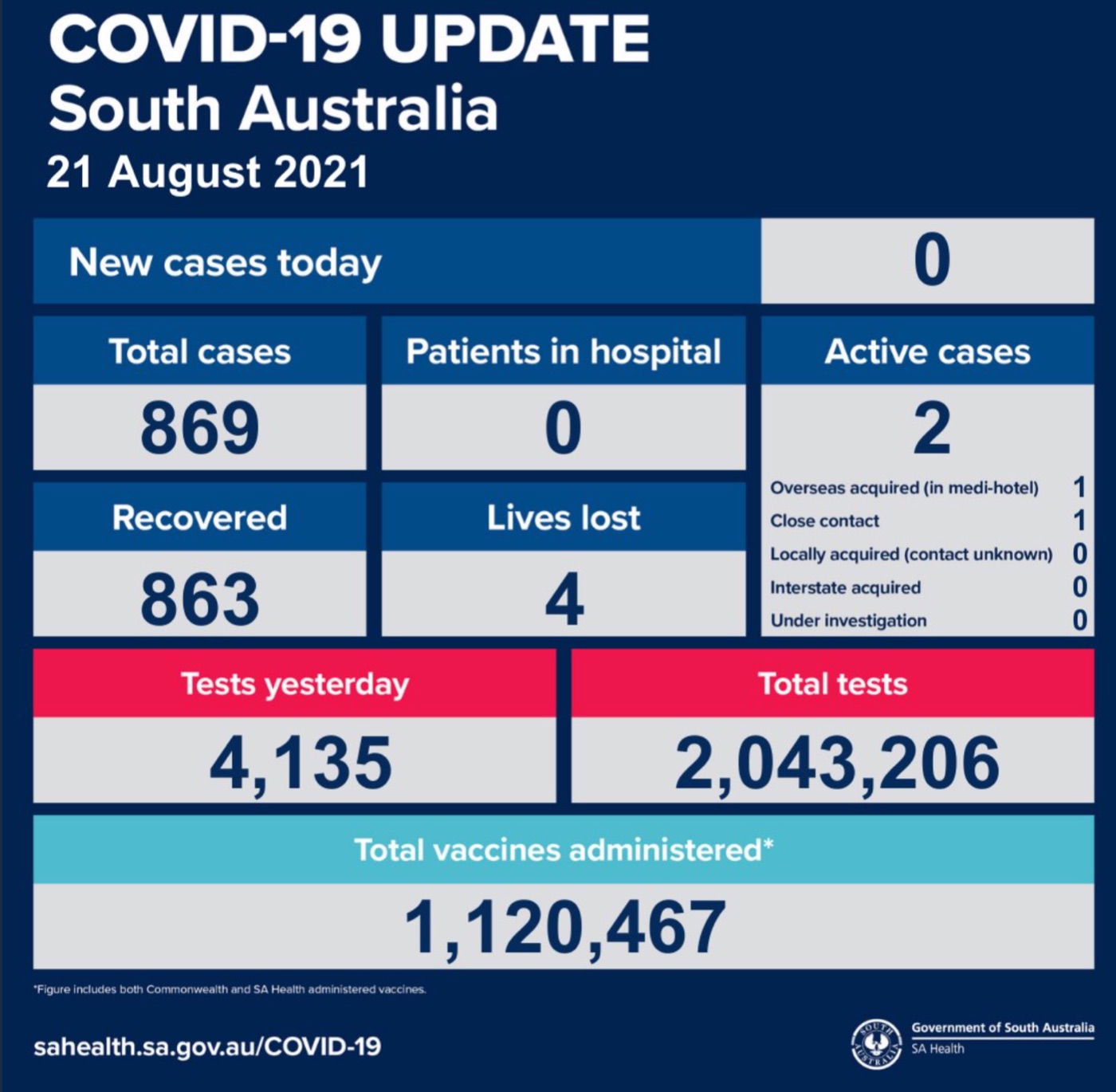 2021年8月21日,星期六,南澳新冠病例情况更新如下: 无新增确诊病例! 活跃病例2例,无患者在医院中康复与治疗。 康复863例,死亡4例。 昨日共进行检测4135次,累计检测2043206次 图文来源 ...
