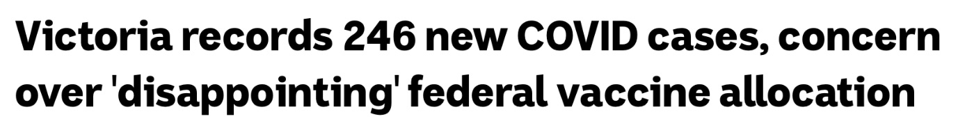 维多利亚州记录了246例新增本土获得的COVID-19病例,州政府对联邦政府计划在今年剩余时间内分配辉瑞公司的剂量表示关注。 周一,Foley先生说,该州比计划中的目标 "提前了一点",即在9月23日之前让 ...