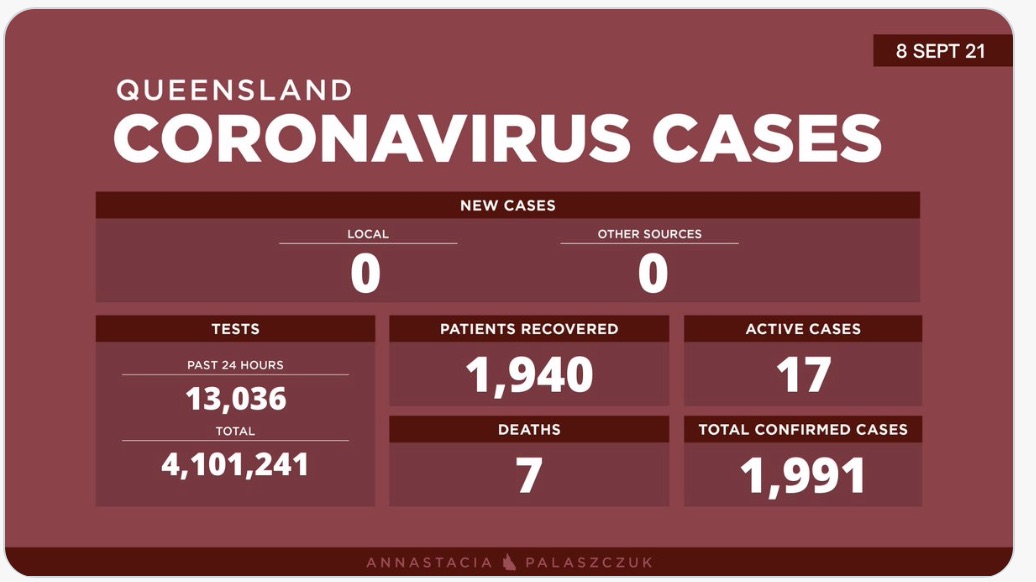 9月8日星期三- 昆士兰的冠状病毒病例更新: - 0例新的本地感染病例 - 0例海外感染病例 - 17例活动病例 -累计确诊 1,991例 - 累计进行了4,10,1241次核酸测试​ 图文来源:twitter [url=https:/ ...