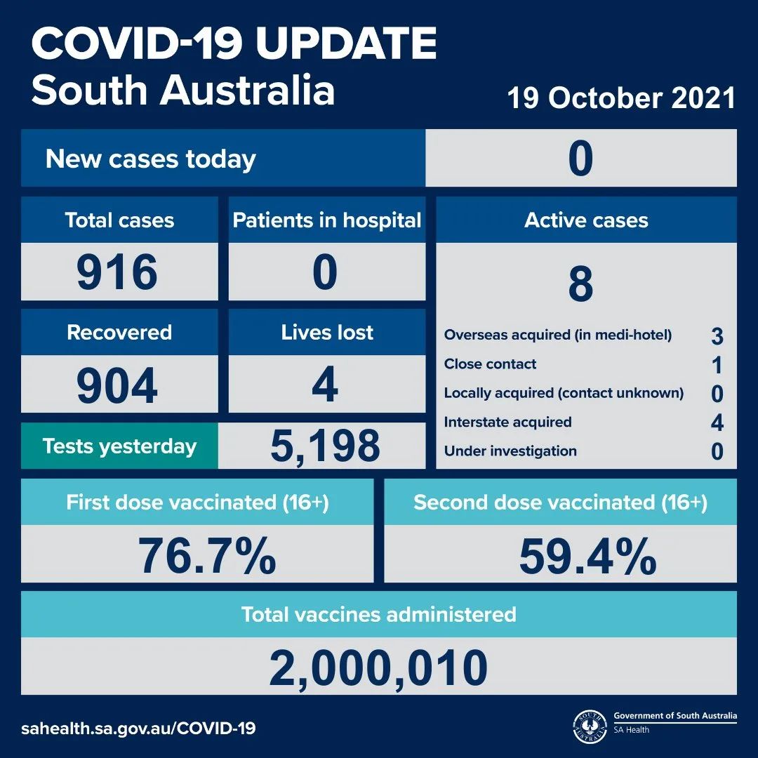 2021年10月19日,星期二,南澳新冠病例情况更新如下: 无本地新增确诊病例;1例海外获得的病例,是70多岁的一位女性,在海外感染,自从进入南澳,一直在酒店进行隔离。 活跃病例8例,无患者在医院中康复与治疗。 ...