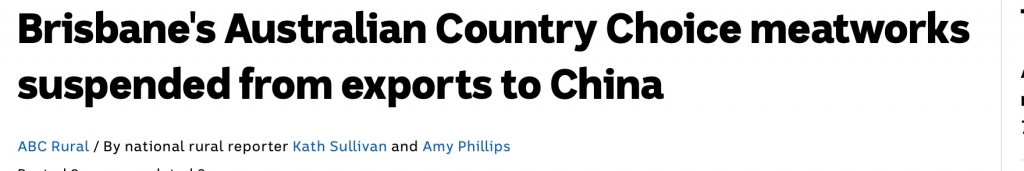 总部设在布里斯班的澳大利亚国家选择公司(ACC)接到澳大利亚当局的通知,从10月18日起暂停对华贸易。 在一份声明中,ACC表示,中国当局在其Cannon Hill屠宰场加工的肉类中检测出一种通常用于治疗狗的细菌感染的 ...