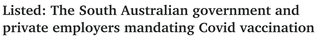 越来越多的南澳政府部门和私人雇主强制要求员工、客户、供应商和委托人接种两针疫苗。 政府部门 学校/早期教育 南澳所有政府和私立学校以及幼儿教育机构的所有工作人员和志愿者都必须接种两针疫苗。教育 ...