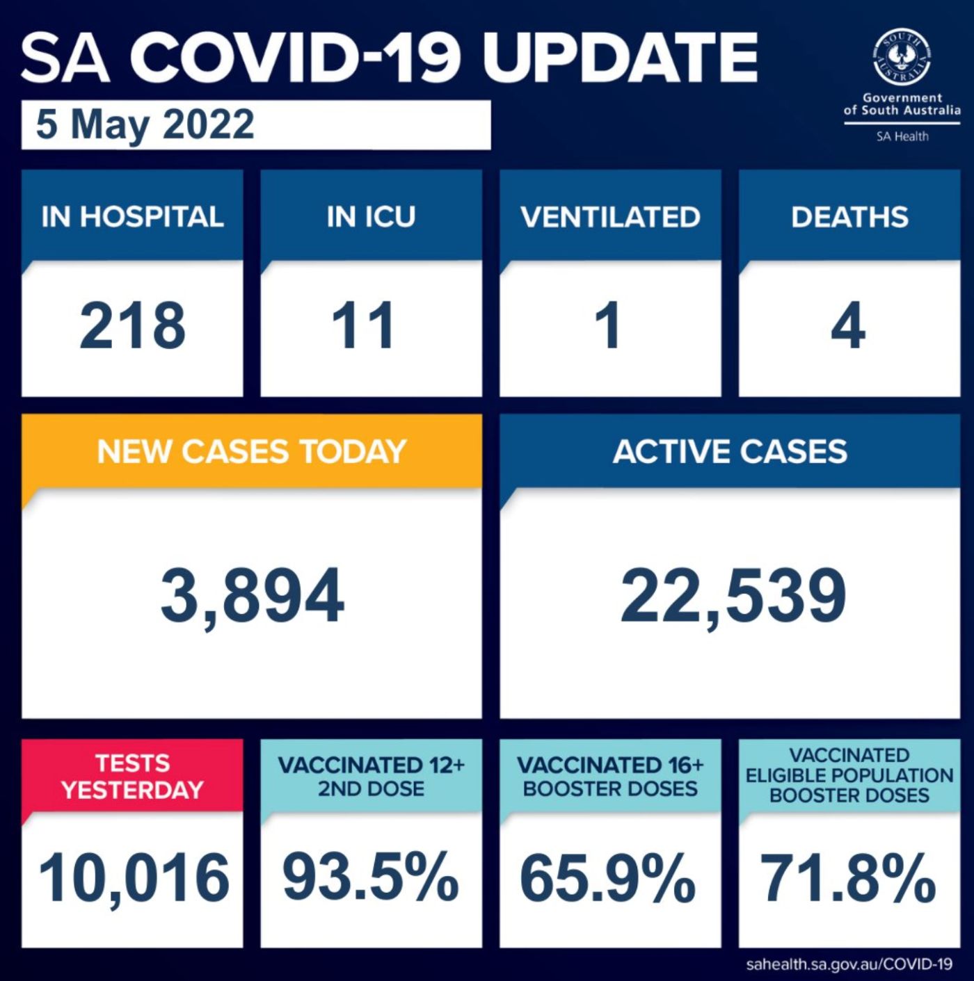 在过去的24小时里,南澳新增3894例确诊病例,4人死亡! 目前南澳有22,539个活跃病例。 南澳卫生部证实,有4人死亡,分别是两名80多岁的男性和两名80多岁的妇女。 目前南澳有218名COVID-19患者住院,其中11人 ...