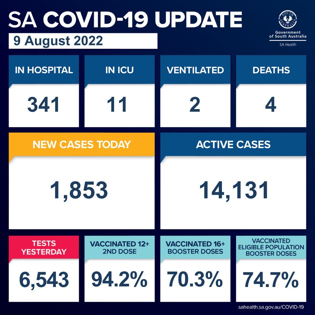 在过去的24小时里,南澳新增1853例,4人死亡。 目前南澳有14,131个活跃病例。 南澳卫生部证实,有4人死亡,是一名50多岁的妇女、一名80多岁的妇女、一名90多岁的妇女和一名80多岁的男性。 目前南澳 ...