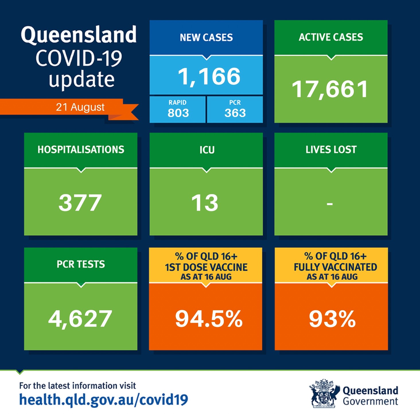 在过去24小时里,昆州新增1166例,死亡人数不明。 其中PCR检测363例,快速检测803例。 目前全州活跃病例为17661例。 共有377人因covid住院,13人住在重症监护室。 全州16岁以上人群两针接种率为93% ...