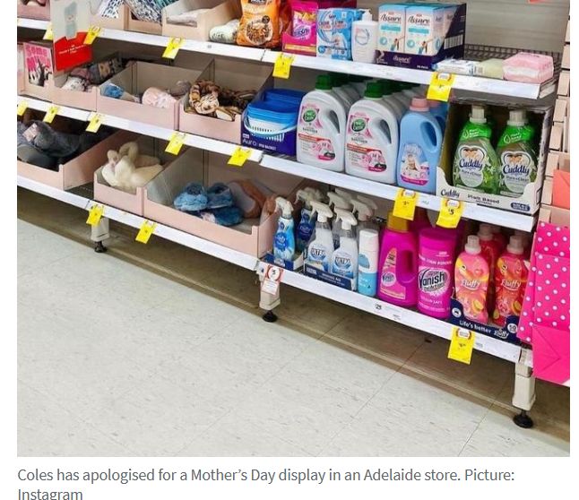 Coles为其在阿德莱德一家超市的母亲节展品道歉,该展品给购物者留下不好的印象。 "洗衣粉出现在母亲节。你在跟我开玩笑吗,Coles ?"一位女士当时在Facebook上写道,并附上一张 写有"性别歧视 "的 ...