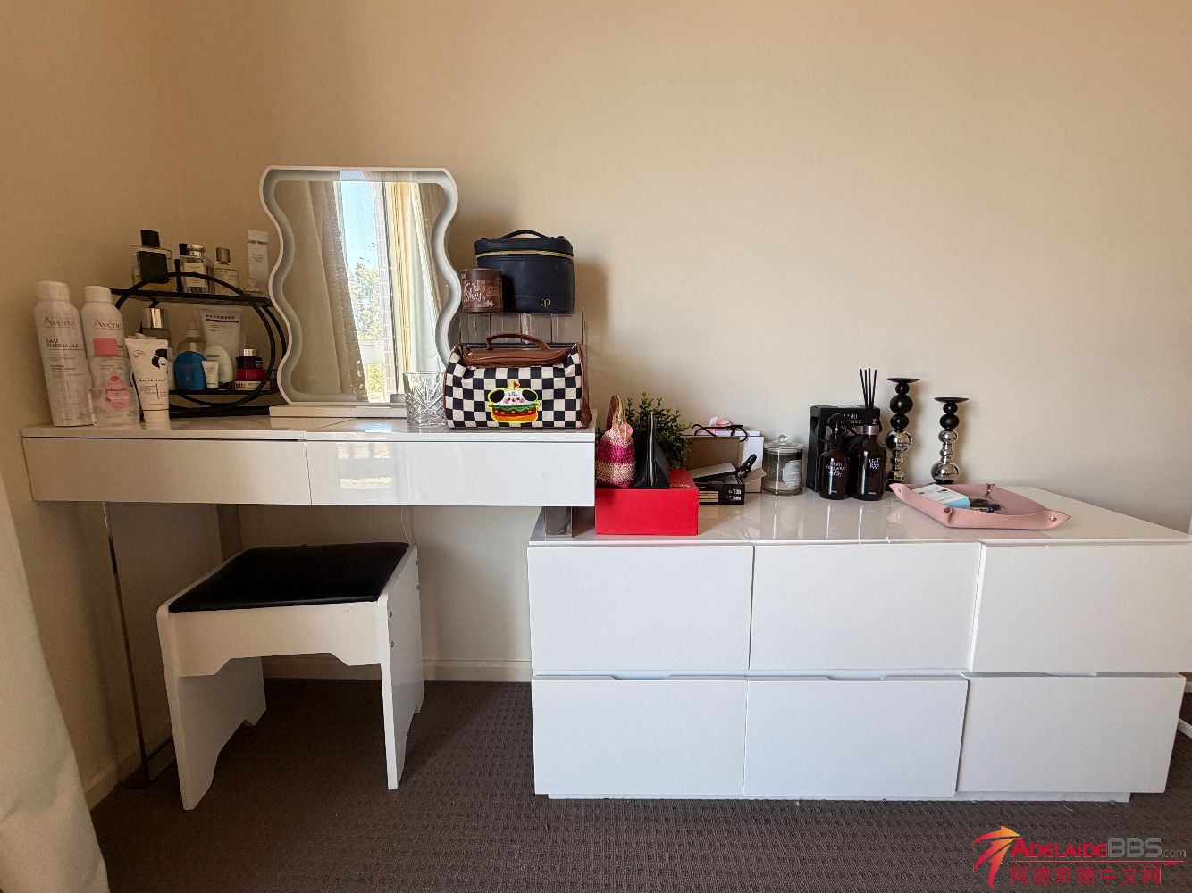因本人搬家,现出售家具如下: 多功能白色梳妆台 / 化妆桌(双桌组合) 这款白色梳妆台由两张配套桌子组合而成,可作为化妆桌和收纳柜使用,收纳空间充足。桌面可掀开,内置首饰收纳格。 &nbs ...