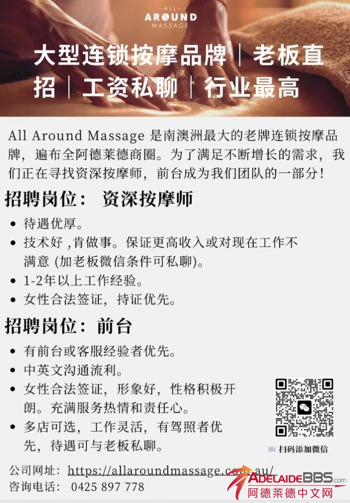 大型连锁按摩品牌|老板直招|工资私聊|行业最高 All Around Massage是南澳洲最大的老牌连锁按摩品牌,遍布全阿德莱德商圈。为了满足不断增长的需求,我们正在寻找资深按摩师,前台成为我们团队的一部分! 招聘岗位: ...