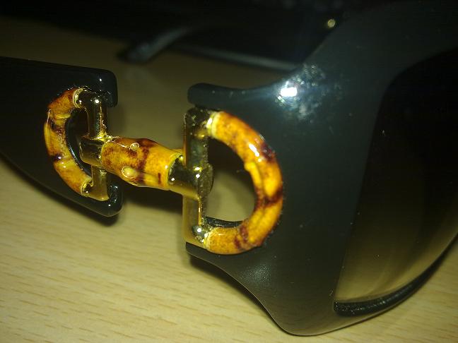 本帖最后由 cookie.cheung 于 2011-4-16 22:19 编辑 比较特别的一款GUCCI太阳眼镜. 镜片是黑色渐变, 侧面的logo是竹节. 细节图 开了闪光灯, 所以拍的不是很好看= = 眼镜不是全新的, 但是只戴过几次. 现在 ...