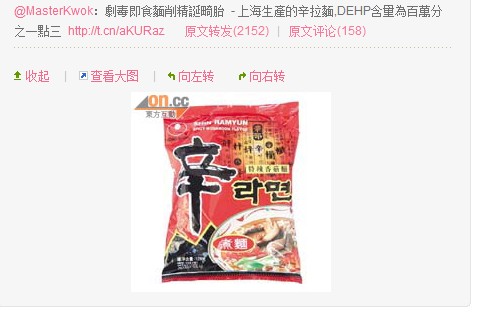 上海生產的辛拉麵,DEHP含量為百萬分之一點三