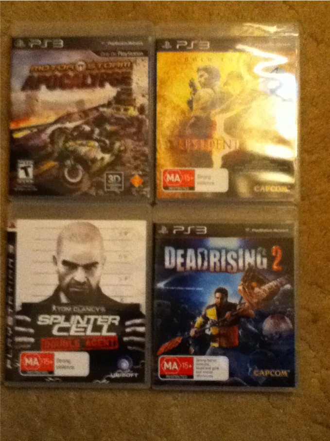 出4个ps3游戏, 如图,疯狂摩托(99新)$20,生化危机5(95新)$15,细胞分裂4(85新)$18,DeadRising 2(99新)$15. QQ 676242446 请注明 卖游戏