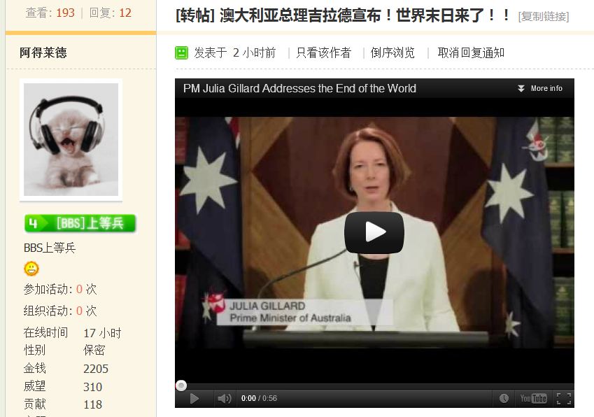 replyreload += ',' + 3463620; 本帖最后由 阿得莱德 于 2012-12-8 15:09 编辑 游客,如果您要查看本帖隐藏内容请回复 这个新闻千万不要相信!2013年元旦,这个将成为2012年度世界最雷人恶搞事件第一名!