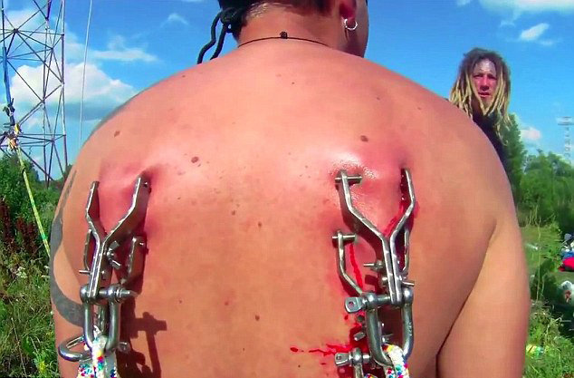 据英国《每日邮报》12月7日报道,几名俄罗斯男子直接用挂钩穿过背部皮肉,然后从250英尺(约合72.6米)的高台一跃而下。他们还将这一过程拍摄了下来。