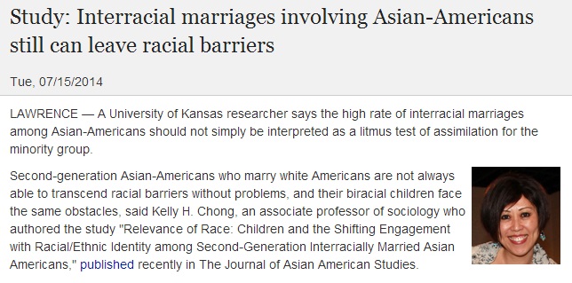 最新研究显示,尽管第二代亚裔与白人通婚已愈来愈普遍,但并不意味亚裔配偶可打破种族籓篱,甚至亚裔跨种族婚姻的混血子女,仍难避免歧视。 这项在亚裔研究期刊最新发表的研究,访问对象包括华人和韩 ...