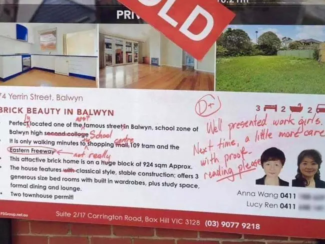 墨尔本东郊旺区Balwyn的一幅房售广告牌因为英语语法漏洞百出,被“好心”路人修改批注,打分不及格,放在网上,获得万人点击。两位售房的华人女中介也因此一夜爆红,成为墨尔本知名度最高的女中介。不说英语才可以 ...