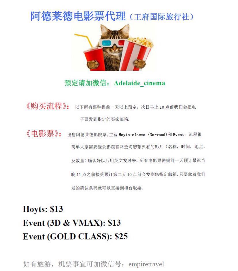 详情可加微信:Adelaide_cinema或者contact no:0416062927