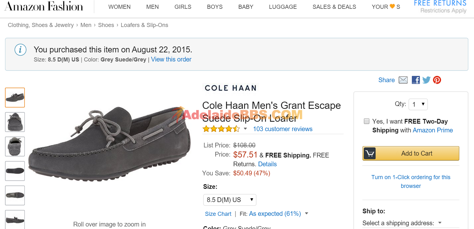 本帖最后由 stc9 于 15-9-2015 11:48 AM 编辑 出售一双cole haan男士豆豆鞋,购于美国亚马逊,有亚马逊订单,鞋子未拆封条所以就截图网上照片了美码8.5,差多的就42码这样,但我发现他家的鞋我41码的也能穿感觉也 ...