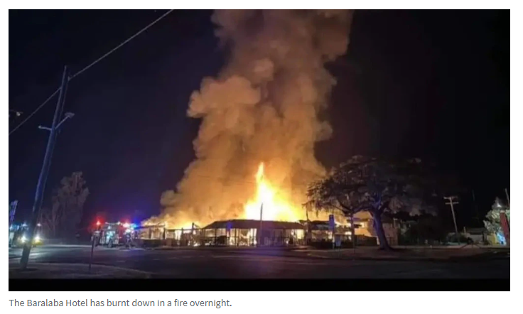 周六凌晨,位于Rockhampton西南约150公里的Banana地区的Baralaba Hotel发生大火,顾客被紧急疏散。