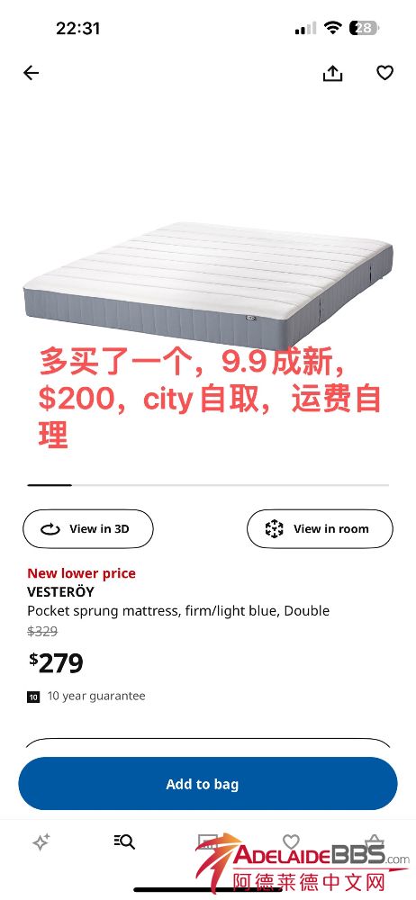 丫a丫a 发表于 1-7-2024 22:37 9.9成新ikea床垫,多买了一个,便宜出 $200,可小刀,city自取,运费自理