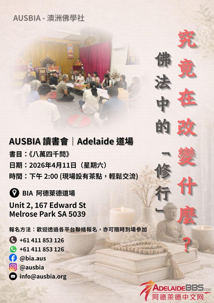 我們即將有一場讀書會,形式輕鬆,適合交流討論 时间:2026年4月11日(星期六)下午2:00 地点:Bodhi Institute Australia (BIA) 澳洲佛学社 2/167 Edward St, Melrose Park SA 5039 本活動免費參加 歡迎預約到 ...