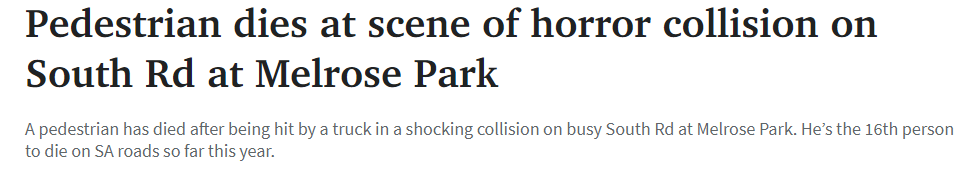 标题: 南澳Melrose Park的South Rd发生车祸,一名行人当场死亡!