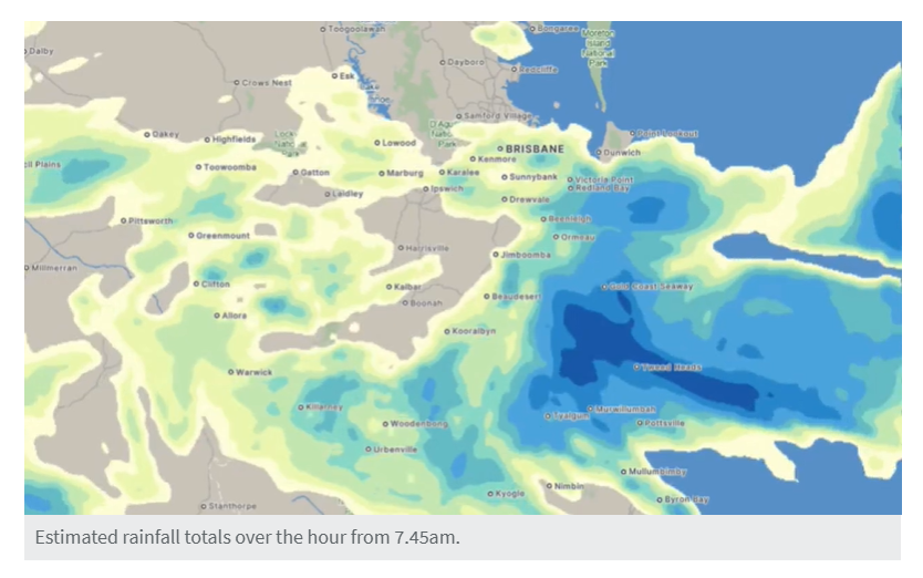 新州北部部分地区累计雨量已超100毫米,今晨雨势最强者集中于黄金海岸南部,Currumbin Valley录得50毫米。Gympie附近Goomboorian夜间降雨量达82毫米。