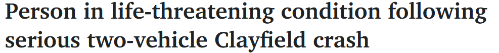 布里斯班Clayfield两车相撞,至一人重伤,道路封闭!