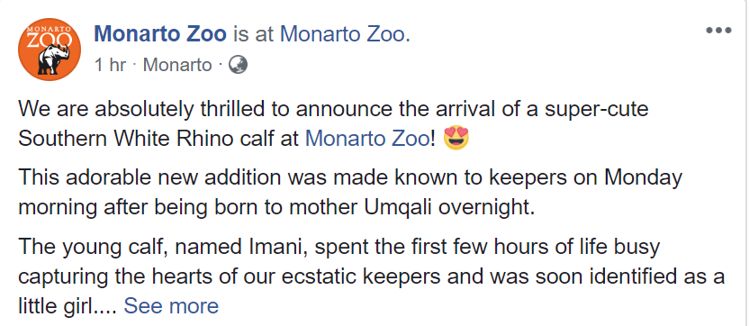 周末要是不知道去哪儿玩耍, 就来Monarto Zoo吧! 因为动物园刚添了新成员! 呆萌呆萌的! 今天,Monarto Zoo的facebook主页宣布了这个令人信息的好消息! “我们非常激动地宣布,一只超级可爱的白犀牛宝宝降临 ...
