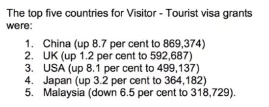 签证是开始出国旅行或留学的第一步! 然而,不少人在来澳洲的第一步上就被拦下了…… 根据澳洲移民局官方数据显示, 在上一财年从2018年7月1日至2019年6月30日,来自中国的旅游签证申请人数在各国的排名中,位居 ...