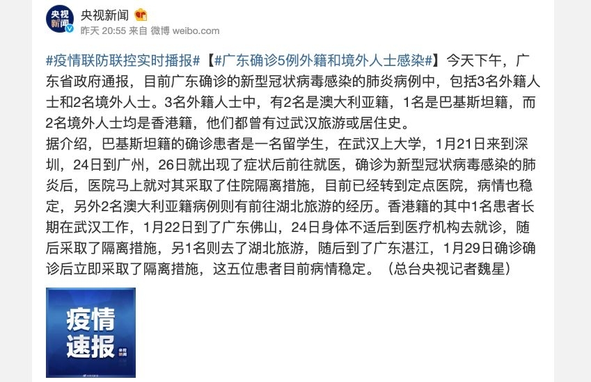 昨天,广东确认5例外籍和境外人士感染病例, 其中有2名为澳大利亚籍。 [color=rgb(153, 153, 153) !important]半小时前 上传 西澳昨天又出现了一例疑似病例。