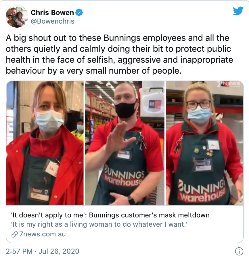 据7 news报道,今天(7月27日),一名墨尔本女子因为拒绝戴口罩而斥责一名Australia Post员工的视频在网上疯传。 这名女子被人们称为“Karen from Bunnings”,因为在此前的一段视频中,她告诉一家Bunnings的经理她 ...