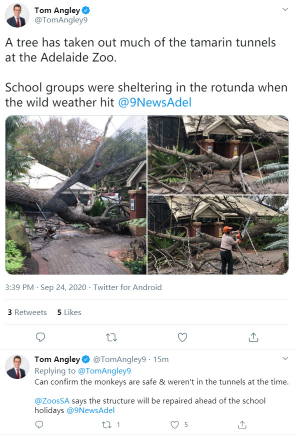 今天阿德莱德多个城区出现强风天气。上午,阿德莱德动物园一棵大树被吹倒,砸坏了卷尾猴(Tamarin)展区的部分设施。所幸事发时无动物在内,未造成人员伤亡或动物走失。动物园称,已安排维修,将在学校假期开始前正 ...