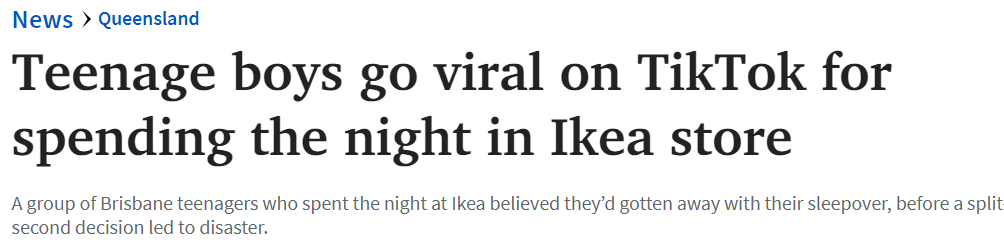 据报道,近日两名青少年男孩在Logan宜家店内过夜的视频在TikTok上疯传,警方正在对这起非法进入的事件进行调查。 所谓的宜家挑战始于2016年,当时两名比利时YouTuber拍摄了他们在一家宜家过夜的情景,他们尝 ...