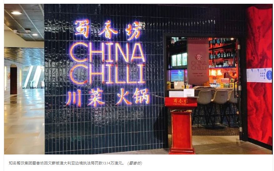 澳大利亚边境执法局(Australian Border Force,ABF)今日公布,知名川菜餐饮集团蜀香坊因拖欠23名员工薪资而被罚款13.14万澳元,并被禁止在两年内为任何外籍员工提供雇主担保类移民。 ABF表示,从2020年1月开始对 ...