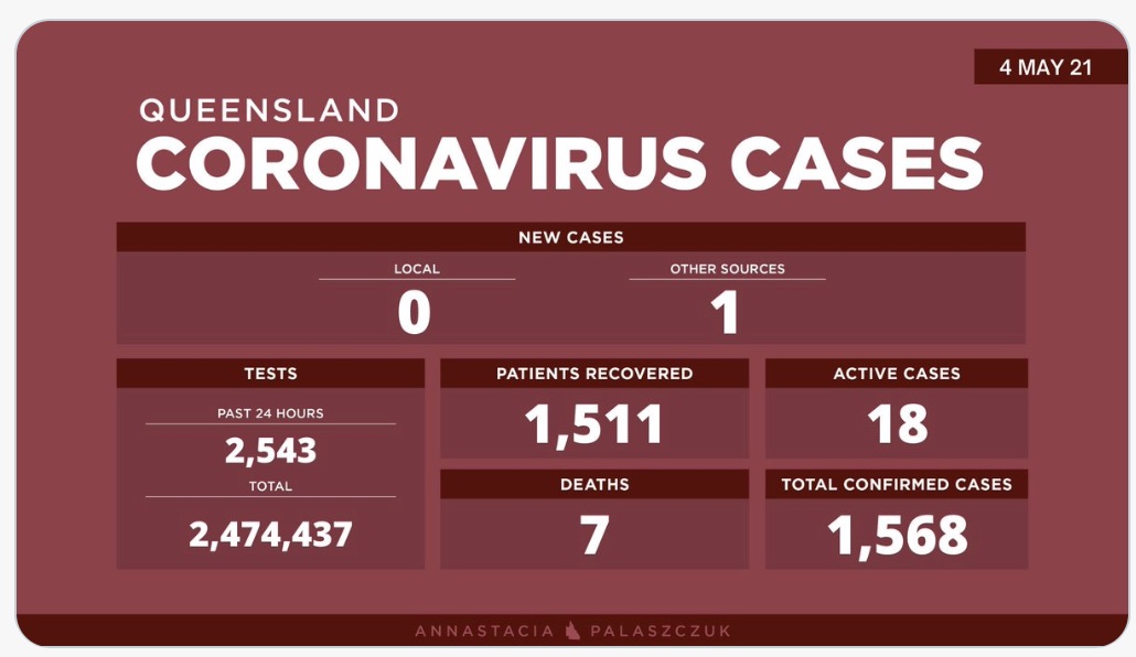 2021年5月4日星期二,昆士兰州新型冠状病毒病例情况更新如下: - 本地新增病例0例 - 海外输入感染病例1例 - 18例活动病例 - 累计确诊1568例 - 累计进行了2,474,437次测试 -死亡7例,康复1511例。 图文来源 ...